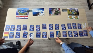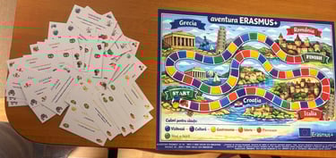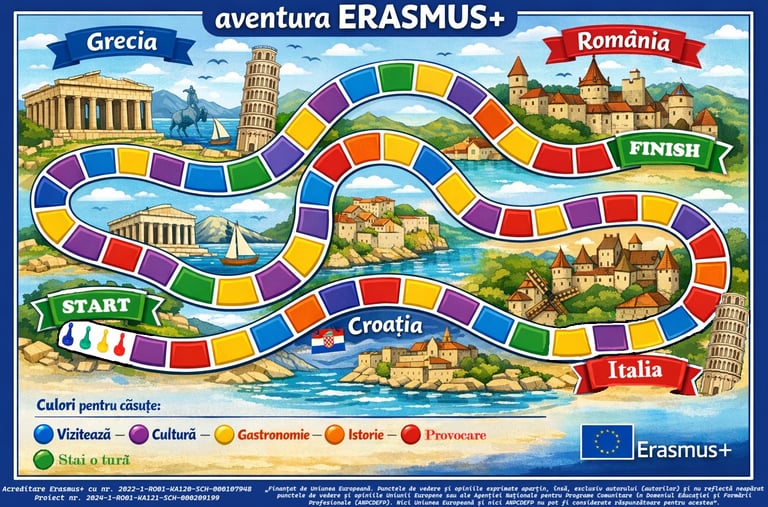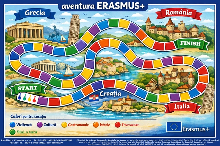 Un joc interactiv de tip „board game” în care participanții parcurg un traseu inspirat din țările partenere ale proiectului Erasmus+.