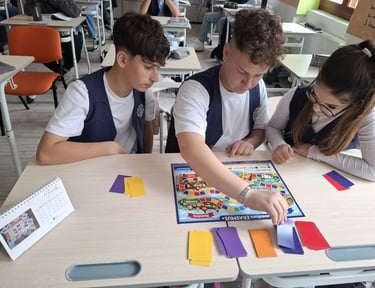 Un joc educativ interactiv realizat pe platforma LearningApps, care implică rezolvarea de sarcini prin asociere, identificare sau răspunsuri corecte, pe baza informațiilor din proiectul Erasmus+.