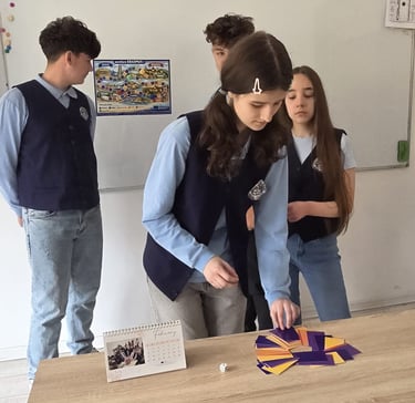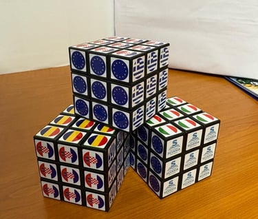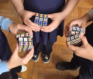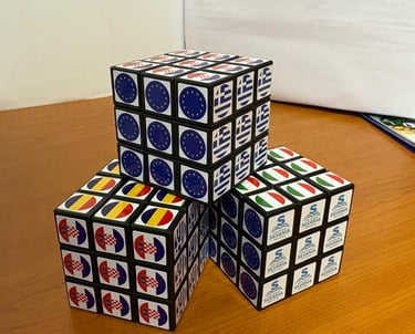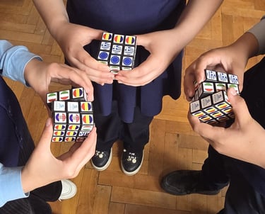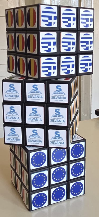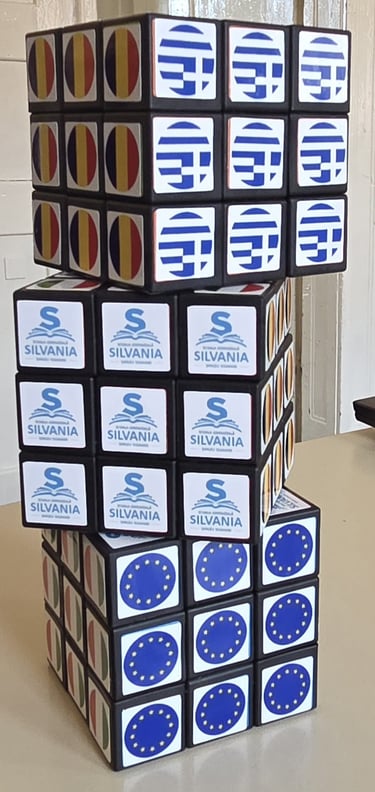 Un cub Rubik personalizat cu elemente vizuale specifice proiectului Erasmus+, folosit ca material educativ și interactiv.