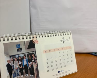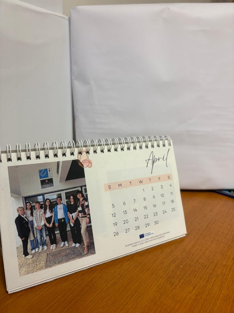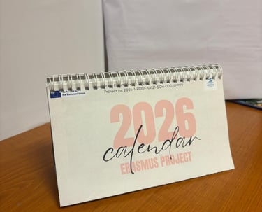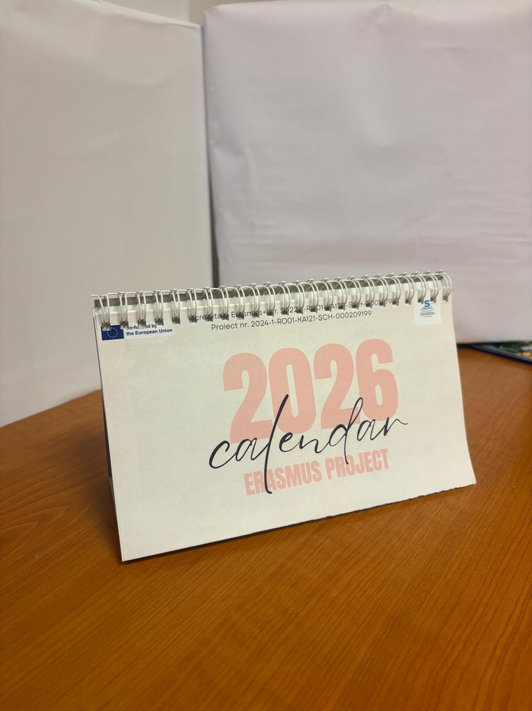 Un calendar personalizat realizat în cadrul proiectului, care evidențiază activități, momente importante și identitatea proiectului.